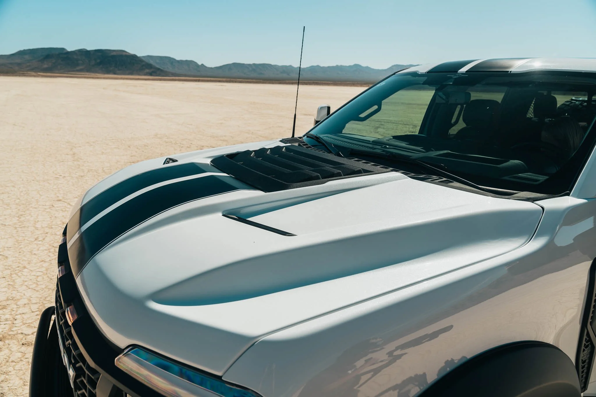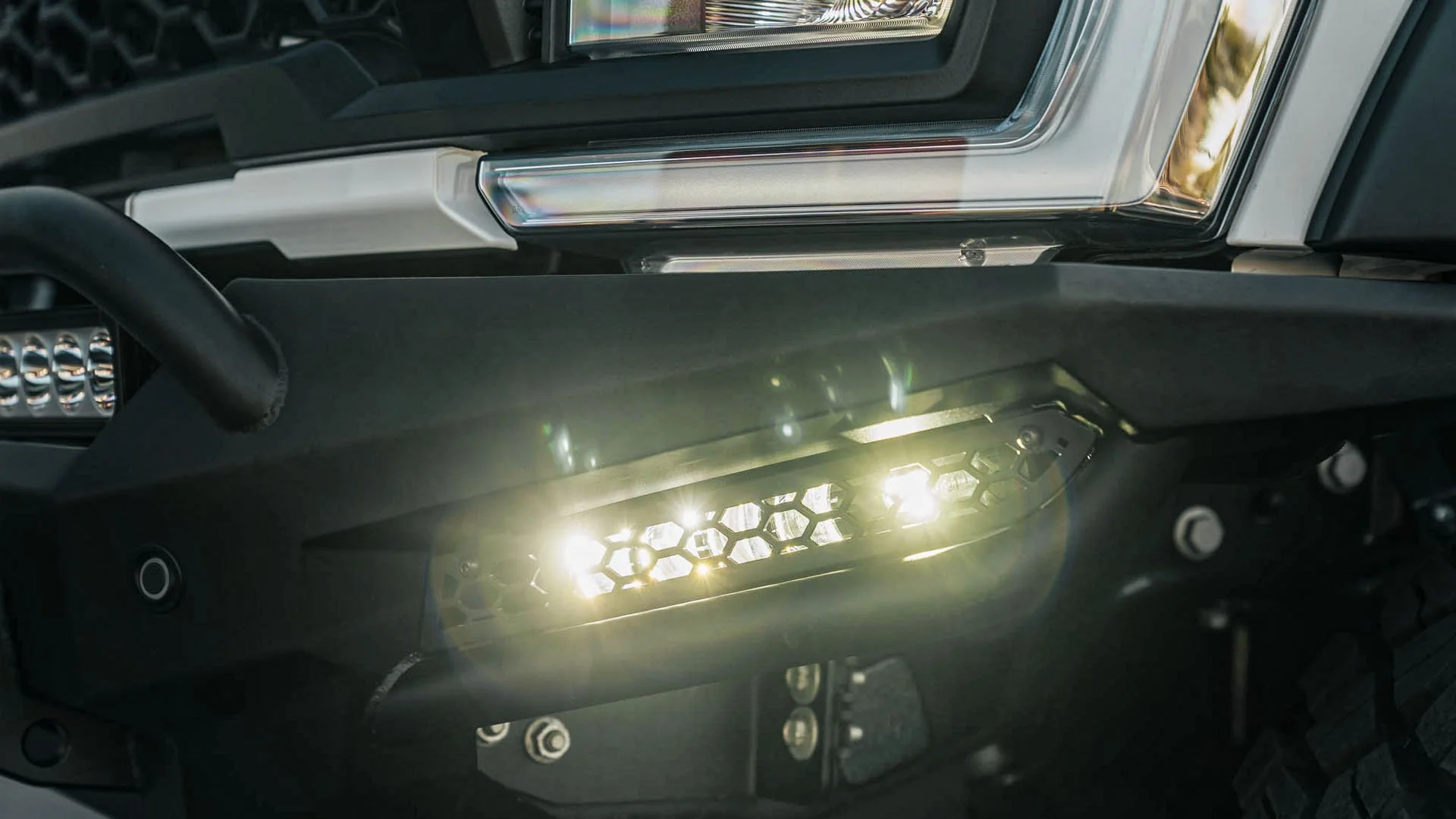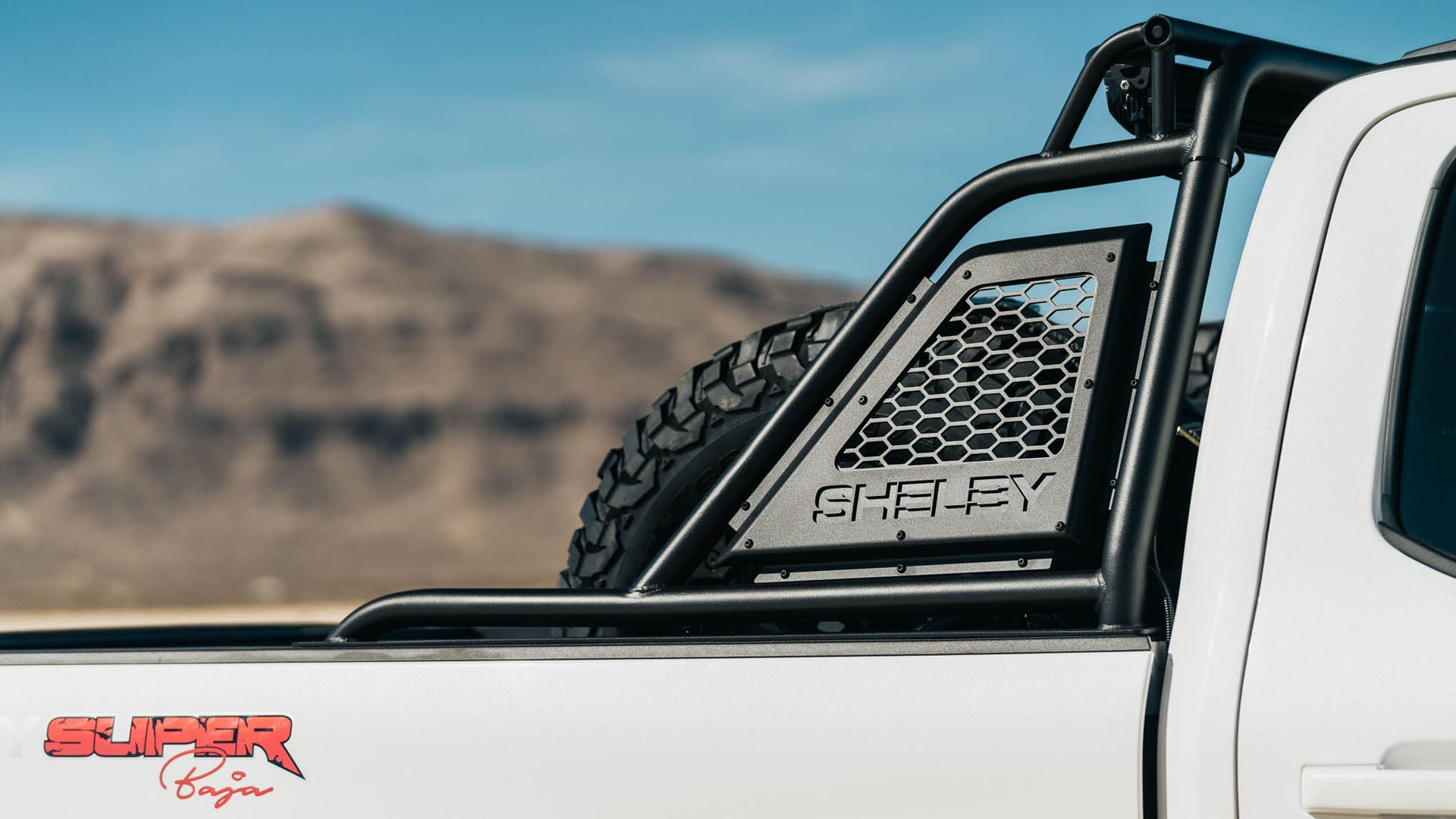 The Custom Shelby Steel Chase Rack Is Designed To Traverse Any Baja Terrain. It Features Two, Full Size, Spare KM3 Mud-Terrain Tires Secured In The Bed Of The Truck. Lighting The Path Is The 50” LED VisionX Light Strip Affixed To The Top Of The Chase Rack. Finishing Off The Rugged Design Is “Shelby Super Baja” Cutout Into The Metal Hex Pattern Side Wall.