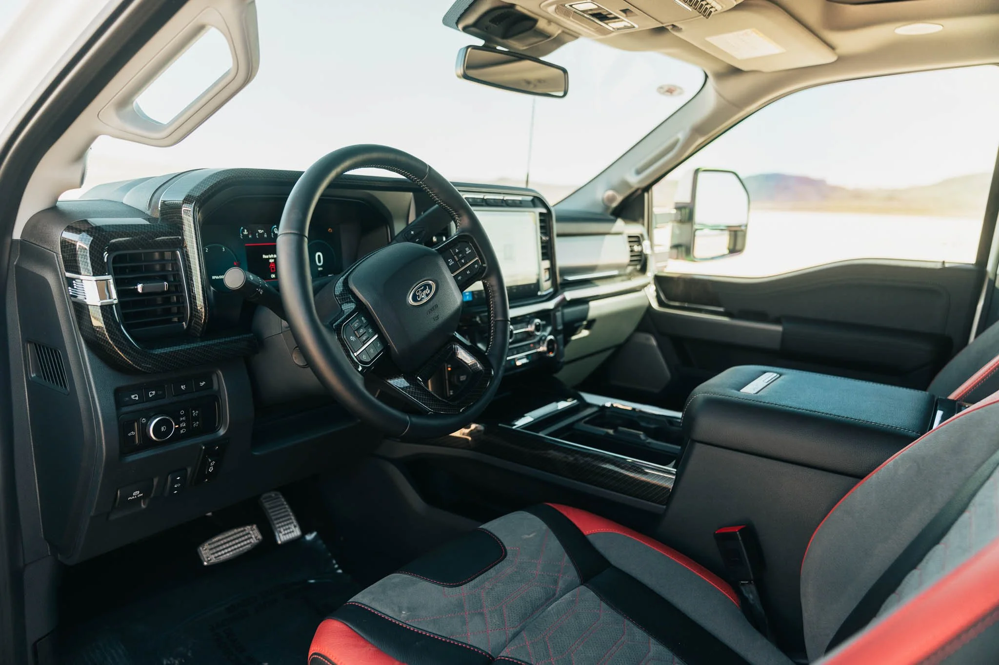 The interior of the Shelby Super Baja F-250 redefines the concept of comfort, ensuring that you're at ease no matter where your journey leads. Every Shelby Super Baja F-250 is distinguished by its unique interior, featuring special upgrades like Shelby Super Baja embroidered floor mats, precision-crafted billet racing pedals, a sleek carbon fiber trim kit, luxurious Shelby leather seat covers, and an exclusive touch - the Shelby CSM serial number plaque, proudly displaying its exclusivity.