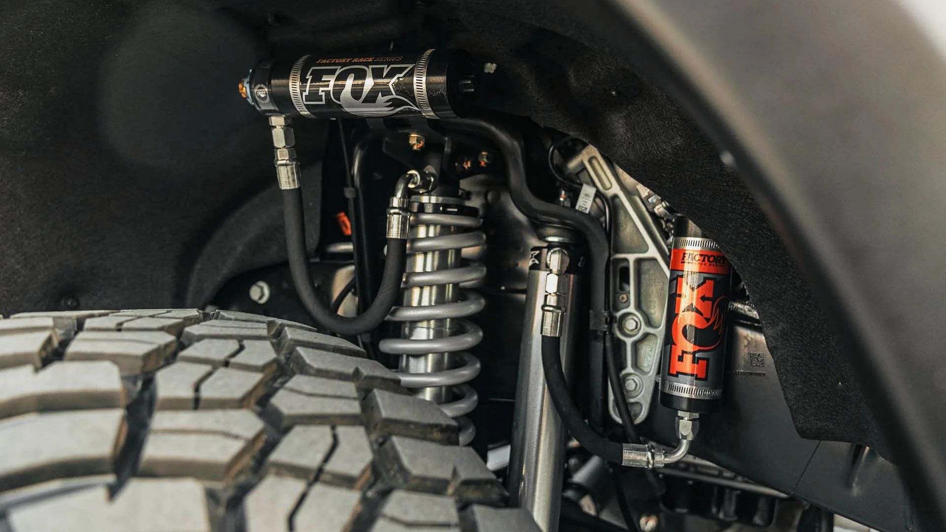 FOX 2.5 Race Series Coilovers with Adjustable Remote Reservoirs, Additional FOX 2.5 Race Series shock with adjustable remote reservoir, Rear FOX 2.5 Race Series shocks with adjustable piggy back reservoirs, and FOX 2.0 Adventure series dual steering stabilizers