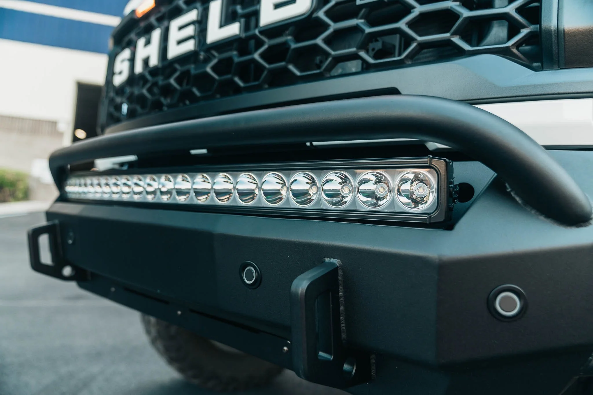 Shelby Super Baja Front Bumper Replacement Includes: Shelby Branding, Tow Points, Air Flow Vents, 40" Curved LED Light Bar, and LED Compliant Lights