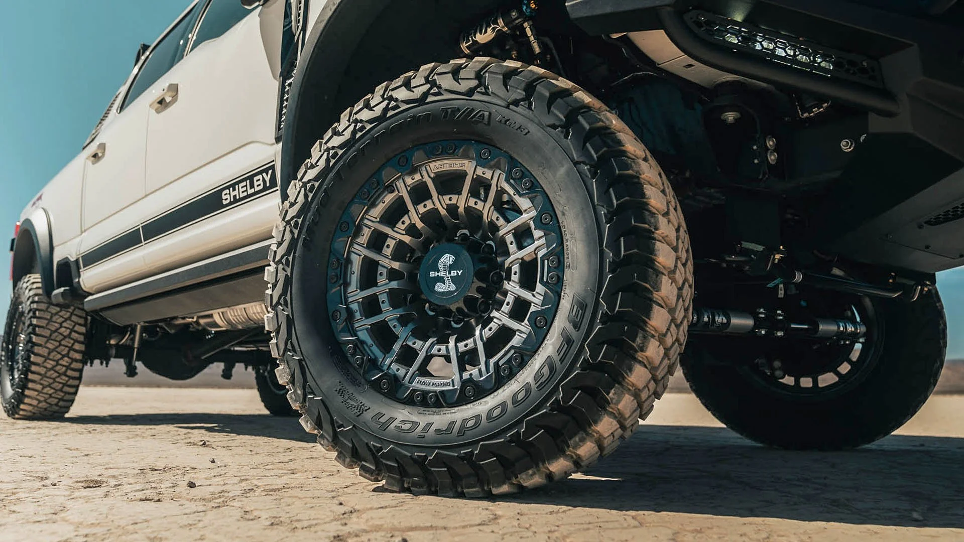 Inspired By A Baja Style Race Suspension, The Shelby Super Baja Features A Shelby Tuned FOX 2.5 Factory Race Series 6 Shock System. The Front Utilizes FOX 2.5 Adjustable Reservoirs With Coilovers And A FOX 2.5 Backup Adjustable Reservoir: Providing Both Off Road Performance And On Road Luxury Ride Quality. The Rear 2.5 FOX Factory Race Adjustable Shocks With Piggyback Reservoirs To Round Off The Most Capable Shock System Ever On A Shelby Truck.